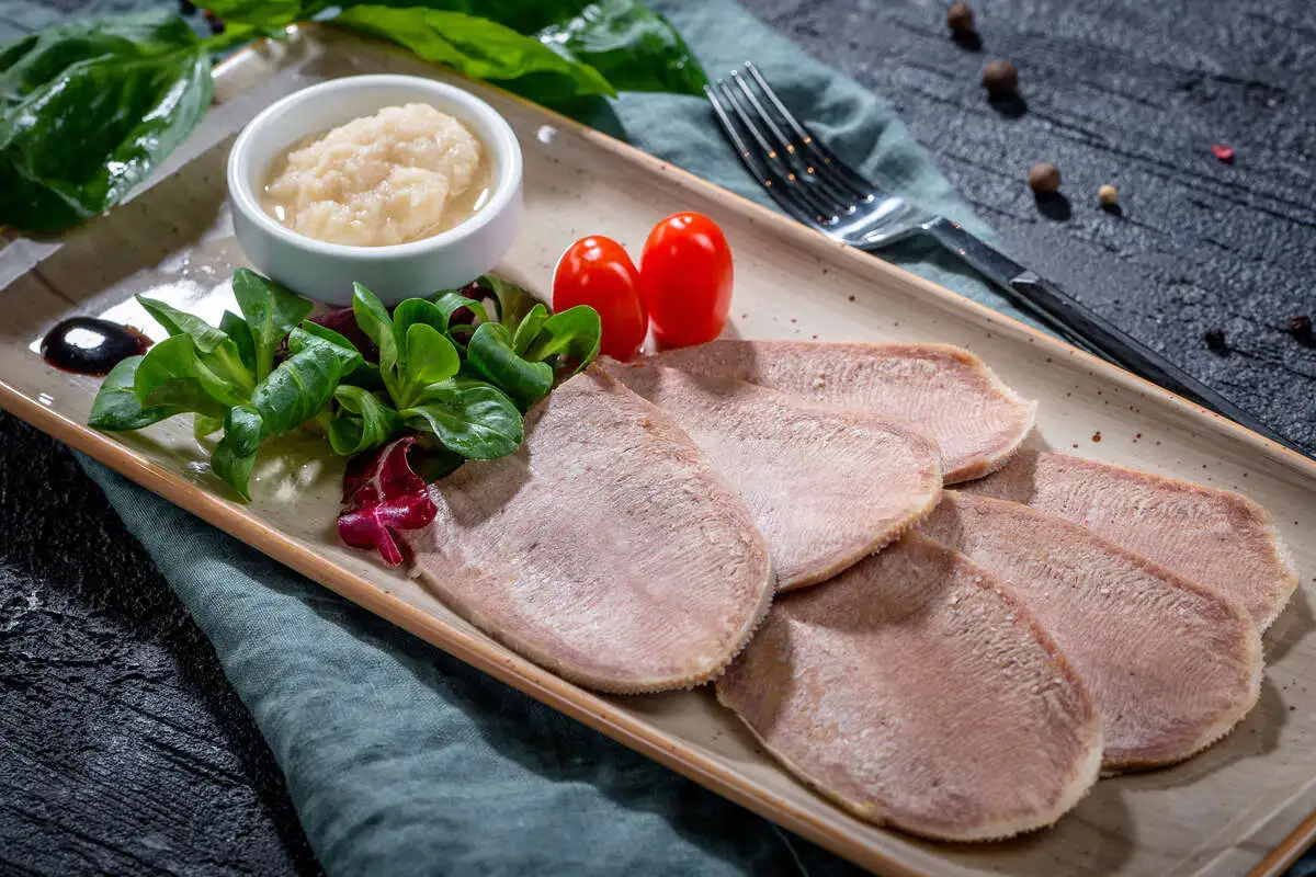 Langkah paling penting ialah mengupas, yang mesti dilakukan sejurus selepas memasak. Potong hujung lidah yang lebih tebal, buat hirisan memanjang dan tarik kulit kasar di bahagian luar bersama papila. Jika kulit sukar ditanggalkan, rendam semula lidah dalam air mendidih selama beberapa minit.
